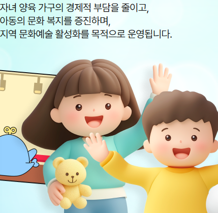 공연, 전시, 영화, 서점, 체육활동, 예체능 학원 등 다양한 문화 활동에 사용할 수 있어, 아이들의 문화 향유 기회를 확대하고 양육 가정의 부담을 줄이는 것이 목표입니다.