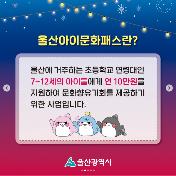 울산아이문화패스는 울산에 거주하는 초등학생에게 연간 10만 원의 문화예술활동비를 선불카드 형태로 지원하는 정책입니다.