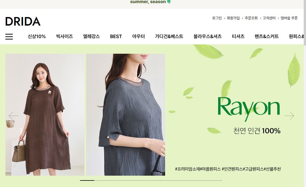 빅사이즈와 중년층을 위한 인견/린넨 원피스를 다양하게 판매. 데일리와 외출용으로 적합.