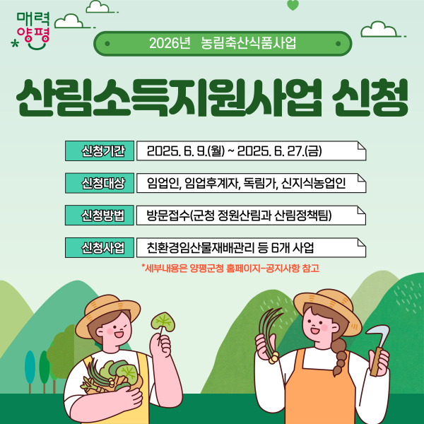 산림보조금, 아직도 모르셨다면 놓칩니다! 2026년 양평군 임업 보조사업 접수 마감은 6월 27일! 임산물 생산부터 유통까지, 실질적인 지원 혜택을 지금 확인하세요!